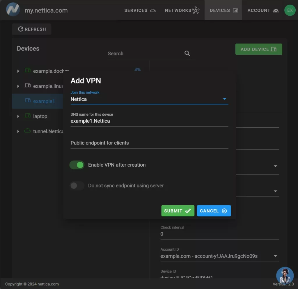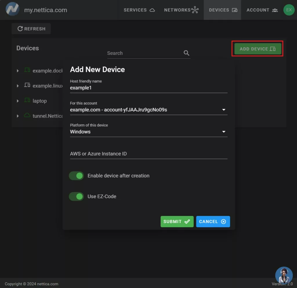 Under the Devices tab, you can view what devices are in your account, as well as which networks they belong to. You can create a device manually (for headless Linux installations), or directly through the Nettica Agent.